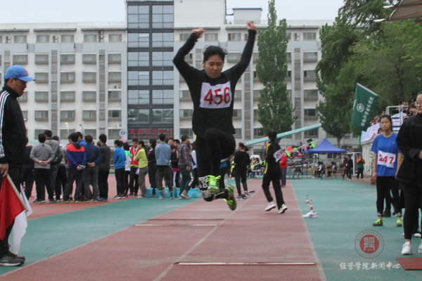 此时田赛赛场上正在举办女生跳远比赛,经管学院的马慧同学蓄势待发,她在踏板上轻轻一踏,便腾空飞了出去,划过一道优美的弧线落在沙坑里。马慧,以4米06这个好成绩获得了女子学生跳远第三名。