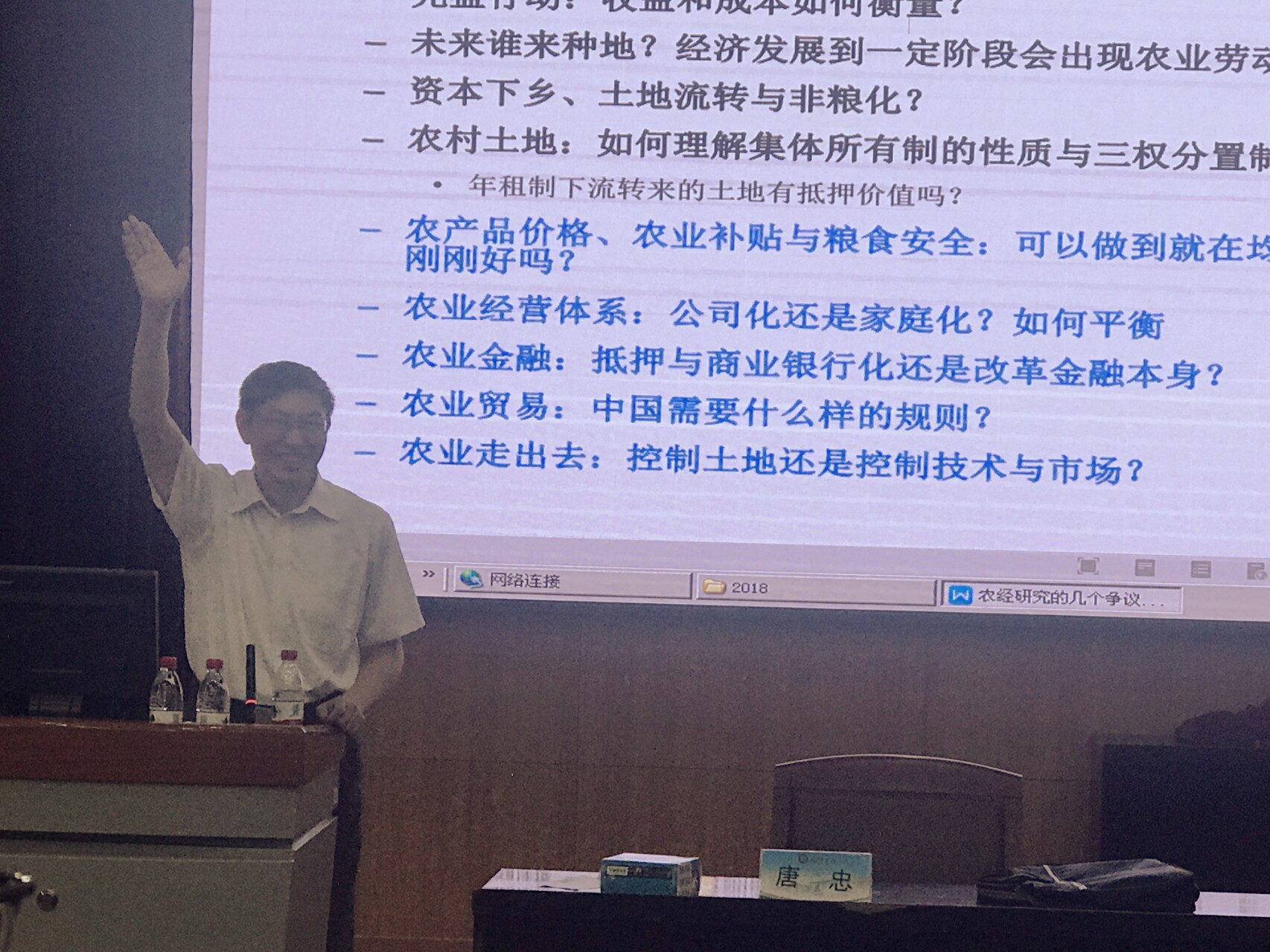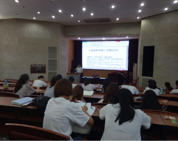 唐忠教授紧密围绕“农经研究中的几个争议问题”展开讲解,生动深刻地讲授并解读了以下话题:新的“农村包围城市”、三权分置下如何理解承包权与经营权、中国农业的挑战、农业会后继无人吗?土地流转导致了非粮化吗?效率较高的劳动力留在了农业还是离开了农业?这些农经领域热点和争议问题的提出,为在座的农林经济管理和农村与区域发展两个专业的研究生开启了农经问题研究的新视角。同学们认真听取唐教授的讲解,有的记笔记,有的用手机拍照。在结束之时,唐忠教授留出时间和在场的所有研究生进行互动,耐心听同学们提问并一一为大家解答。