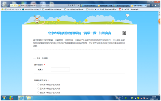 2016年10月27日——2016年11月4日,为期一周时间北京农学院威廉希尔中文党总支通过网络举办“两学一做”学习教育知识竞赛活动。参加此次知识竞赛活动的是威廉希尔中文全体党员,包括学生8个党支部和教师6个党支部,共200人,做到了全员参与,一个不落。