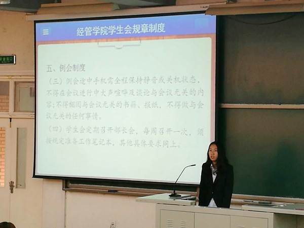 随后,办公室副主任宋展就学生会规章制度进行说明。其中重点强调组织要求、安全制度、工作制度以及例会制度。她希望大家接下来的工作中严格遵守学生会规章制度,全心全意为同学们服务。