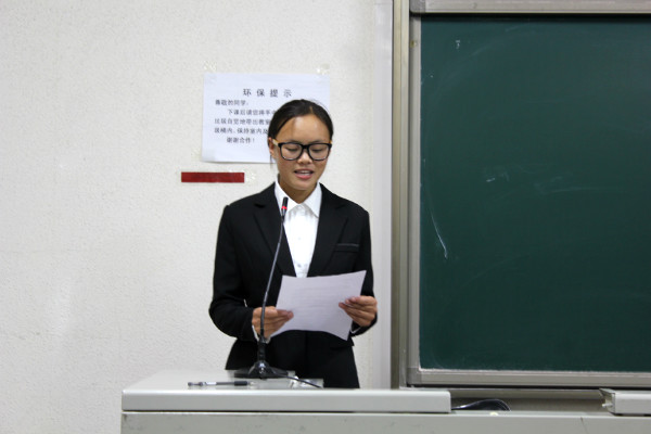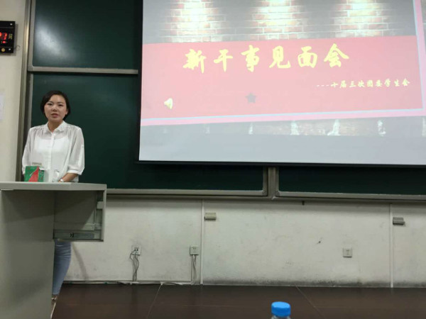 十届三次学生会主席颜佳雯对新干事的加入表示欢迎。她提出了在以后的工作中,新一届的学生会成员要保持严谨的工作态度,尽力做好自己的本职工作,并且表示主席团会一直关注学生会的工作以及各项活动的进行,共创学生会辉煌的未来。