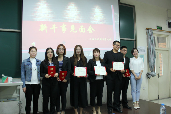 最后,任娇老师和上届学生会主席郝裴裴为本届学生会主席们颁发聘书。各部门分别进行合影留念。