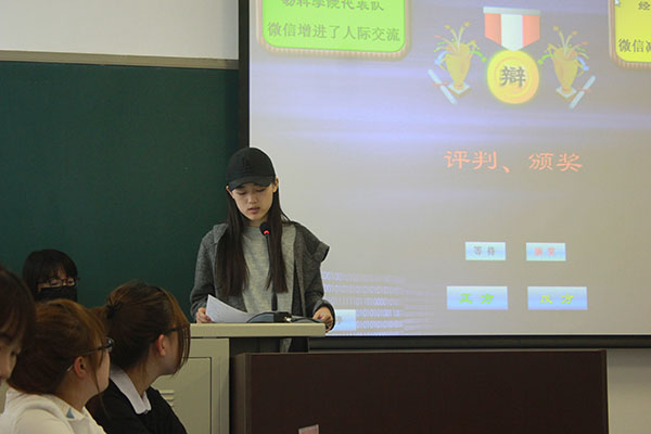 本次辩论赛共分为四轮,第一轮为立论陈词,正方动科学院以“微信增加人际交流”为辩题率先进行论述,而反方经管学院则以“微信减少人际交流”为辩题,以犀利的语言对正方的观点进行反击,双方针锋相对,实力相当,现场气氛不断升温。