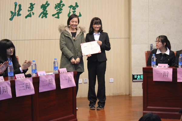 比赛最后,会计专业DBD队摘得冠军桂冠,GBG队一辩姜尚仪同学获得“最佳辩手”称号。“准备比赛的过程虽然艰辛,但却很能锻炼我们的思维,增强我们的团队合作能力,我希望以后能多参与辩论赛。”赛后一位辩手向我们展示着手中的提示牌。