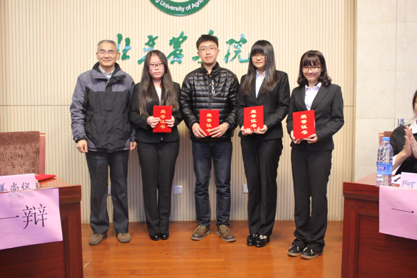 经过为期3周的激烈角逐,北京农学院威廉希尔中文第四届“经管杯”终于迎来了尾声,工商管理专业的GBG队和会计专业的DBD队在2015年11月16日中午12时于图书馆报告厅展开了最后的对决。出席本次比赛的嘉宾有经管学院副院长赵金芳老师、十届二次团委学生会主席郝裴裴、副主席曹如鹏、朱剑峰、朱梓轩以及学生会各部部长。研工部部长姬谦龙老师、经管辩论队资深辩手滕飞、前任队长杨睿担任特邀评委。