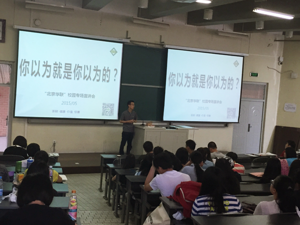 华联集团进行了实习招聘宣讲,并对有意向实习的同学进行了面试。北京华联拥有两家上市公司和多家控股公司,建立了覆盖全国的连锁零售网络,拥有一流的商业管理资源、商品资源、品牌资源和人才资源。业态涉及大型综合超市、精品超市、百货店、购物中心及商业地产等。截止2015年4月,在全国22个省市48个城市拥有166家超市,21家百货门店(另外还有5家在新加坡),1家高级百货(新光天地),及47家大型购物中心。创办了零售学习(2008)与创新中心(2010),帮助我们更好的赢得中国市场。
