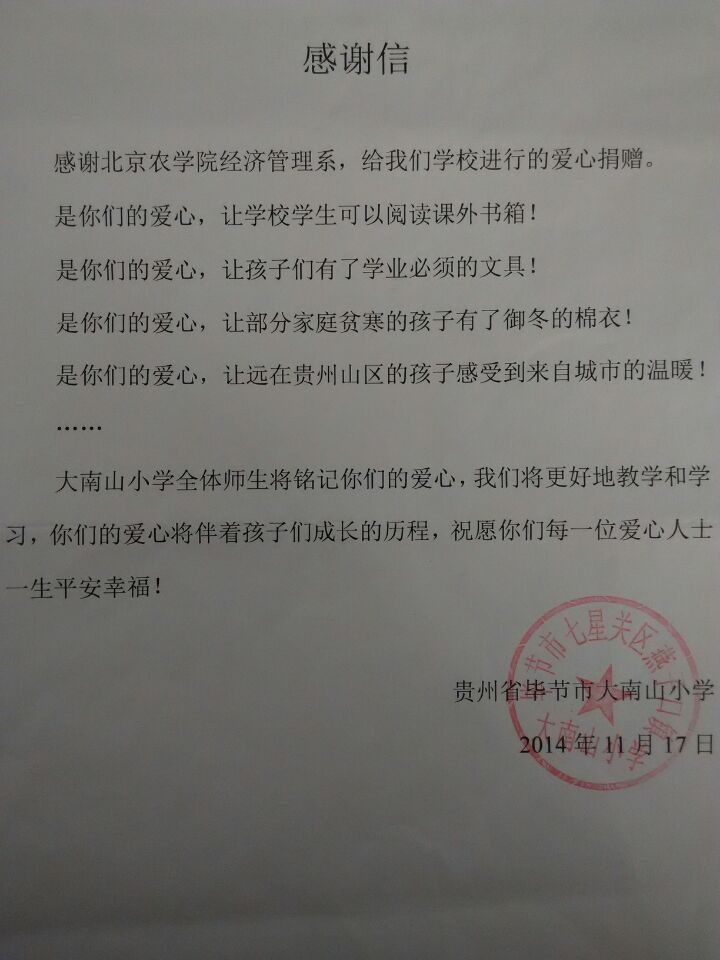 近日,经管学院收到了一封来自贵州省毕节市大南山小学的感谢信,信中写道:“是你们的爱心让远在贵州山区的孩子感受到来自城市的温暖……”信件简短却充满真情,语言朴实却不乏感动,并在信的最后表达了大南山小学全体师生对经管学院爱心捐赠行为的感激之情和将来回报社会的感恩之心。