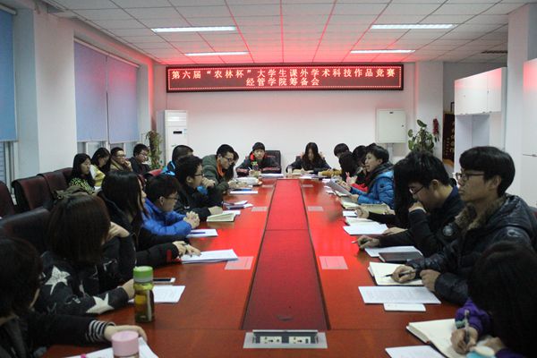 1月14日下午5点,经管学院团委于经管楼401就我校“第六届‘农林杯’大学生课外学术科技作品竞赛召开动员大会”,经管学院团委书记骆金娜老师,团委委员以及13、14级各班班长参会。会议由团委书记骆金娜老师主持。