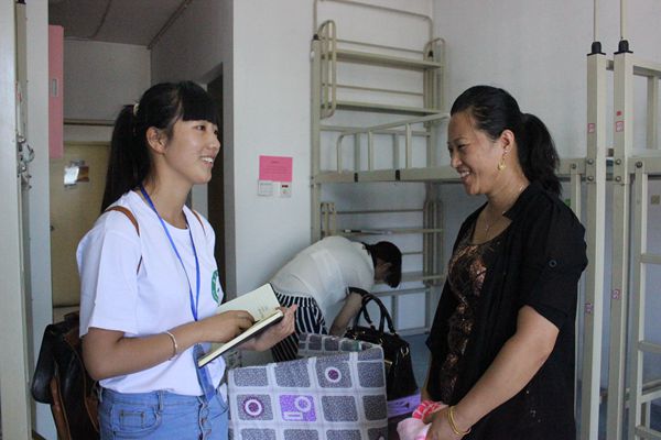 宿舍里,记者采访了一位和孩子一起在志愿者的引导下刚刚进入宿舍的家长,这位女同学的家长对宿舍环境很是满意,觉得宿舍很非常宽敞明亮,硬件设施一应俱全,住宿条件很好。在和志愿者的聊天中,这位家长听说宿舍有严格的关门制度和完善的安全设施觉得很放心。