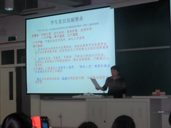 党课上,为了使同学们更详尽的了解发展党员的有关流程,马俊云老师特别讲解了学生党员发展所需的四个阶段20个程序,其中包括制定发展党员工作计划阶段、入党积极分子培养教育和考察阶段、预备党员接收阶段和预备党员教育考察转正阶段。同时提出了发展的“总要求”中“一个严格”,“两个坚持”和“三个落实”。