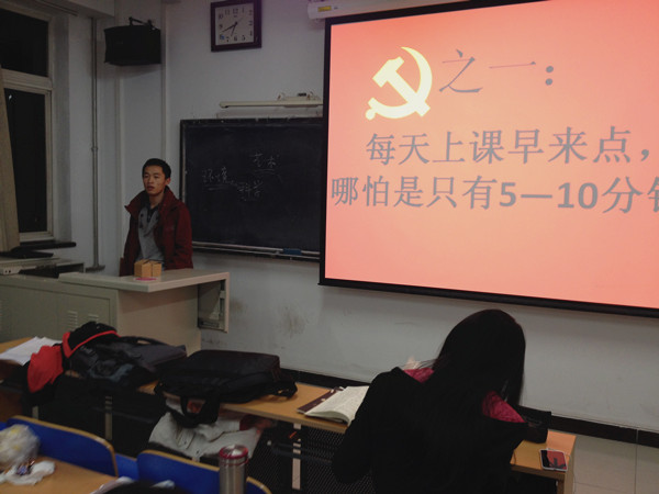会上,刘梦雄分别就学习、生活及社会活动实践三方面对党员及积极分子做出了十点要求。其中,他强调在学习方面,在保证不挂科的基础上更应做深入的研究,为同学提供多类型的解题方法;在生活方面作为党员,应该起到以身作则的作用,无论什么时候,都应该比其他人早到;在社会活动实践方面,应积极的参加各类社团活动,以丰富自己的社会阅历,党员与积极分子应该时刻谨记为同学、为老师志愿服务的事多做一点。这点点滴滴,锻炼的不仅是我们处理事情的能力,更使我们获得了一生宝贵的经验。大家就“党员十做到”展开激烈讨论。