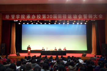 2010年3月25日中午12时30分经管学院承办校第30届田径运动会倒计时30天誓师大会在礼堂隆重召开。出席这次大会的有校党委副书记高东老师,经管学院院长何忠伟老师,副书记李华老师,副院长刘芳、刘柳老师,城乡发展学院院长助理赵宇新老师和经管学院辅导员与各班班主任,以及700余名运动会志愿者们。大会由经管学院团总支书记王月老师主持。
