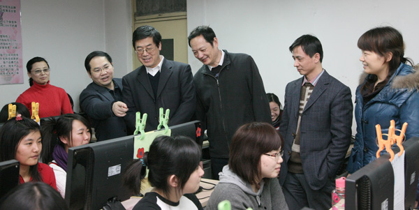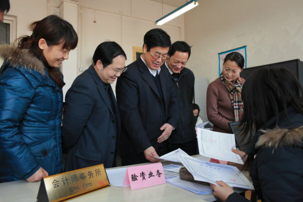 2010年1月13日下午,校长王有年教授在教务处副处长沈文华教授、经管学院院长何忠伟教授的陪同下现场观摩了经管学院“现代服务业综合实训”。王校长参观了第三方物流、招投标中心、国际货代、工商局、税务局、商业银行、会计事务所等外围服务企业,在外围企业环节,王校长饶有兴趣地听取了正在参与招投标企业学生代表的介绍,并与扮演工商局及会计事务所等外围服务业的学生进行了交谈。参观了生产制造核心企业,并听取了扮演核心企业角色的学生对企业战略、企业文化和生产、营销决策的汇报。在参观中,王有年院长与师生进行了交流,他充分肯定了经管学院在大学生实践教学改革中取得的成果。他指出,实践教学是培养和造就具有创新意识和创业能力的高素质人才的重要途径,“现代服务业综合实训”对提升我校经管类大学生综合运用理论知识与实际技能的能力具有重要意义。他希望经管学院要进一步加强团队建设,注重理论与实践,丰富教学内涵,提高教学效果,逐步向全校学生开放。