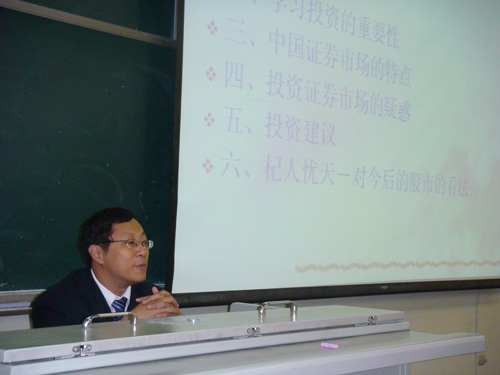 2009年11月10日,上市公司安彩高科的副总经理蔡朝阳应邀来经管学院,为2006级大四同学剖析了中国证券市场,做了题为《证券交易实务》的专题报告。 作为上市公司副总的蔡朝阳先生负责公司的风险投资,上半年投资金额在2亿元左右。由于思路正确,买卖时机恰当,选股准确,取得了很好的投资收益。