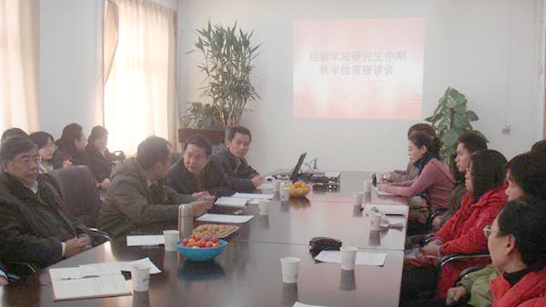 校研究生督导认真的检查了经管学院研究生培养计划、教学大纲,并对研究生教学管理工作中存在的一些问题与与会师生进行了热烈的讨论。邓蓉教授和陈跃雪教授就本人教学工作情况向在座的师生进行了汇报,帮助研究生解答了学习当中所存在问题和困惑。与会研究生也对本人近期的学习生活情况进行了总结,同时,他们也提出了一些有意义的建议。