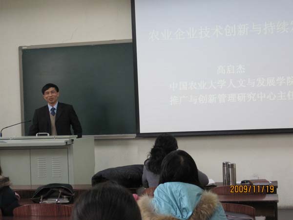 11月19日,中国农业大学人文与发展学院博士生导师高启杰教授为经管学院207级农业经济管理专业的本科生做了主题为“农业企业技术创新与持续发展”的专题讲座,教研室主任陈娆副教授和课程组的相关老师也都积极听取了此次讲座。