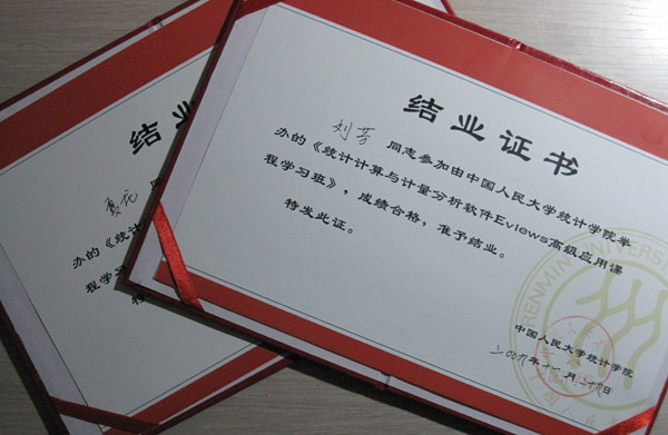 2009年11月28-29日,经管学院刘芳副院长、夏龙老师参加了在人大举办的《统计计算与计量分析软件Eviews高级应用课学习班》,本次学习班由中国人民大学统计学院主办,著名统计学专家易丹辉教授主讲。
