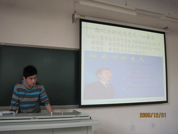 学生在充分准备的情况下,从切身角度对挫折进行了理解,以“挫折的利弊分析”、“积极应对挫折”,“大学生如何面对挫折”等为题进行了富有激情的演讲。演讲从内容是否丰富、重点是否突出、层次是否清晰、阐述是否清楚、课件是否应用得当、理论是否联系实际、声音是否洪亮、仪态是否大方等方面进行评价,学生和老师分别对演讲就上述方面打分,在最后演讲结束时将评出一、二、三等奖。
