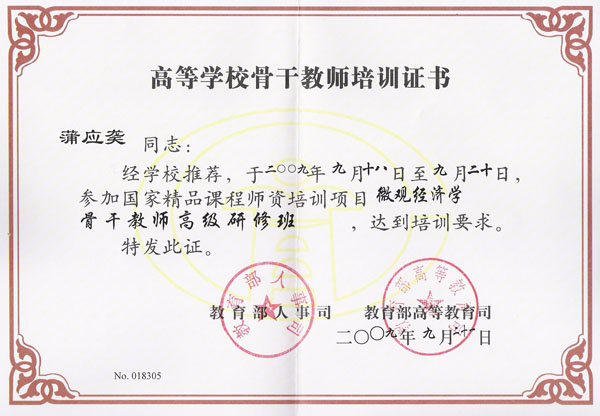 经管学院教师蒲应龑于2009年9月18日至9月20日在教育部全国高校教师网络培训中心的微观经济学骨干教师高级研修班经过为期3天的学习培训,按照要求提交培训作业,考核合格获得高等学校骨干教师培训证书。