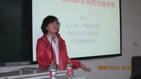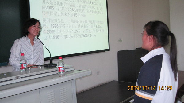 2009年10月14日下午,北京第二外国语学院国际经济贸易教研室白远教授在教B211向国际贸易专业的学生做了题为“文化创意产业发展的理论与创意产品国际贸易的比较研究”的讲座,白教授深入浅出地介绍了文化创意产业的含义和文化创意产业行业分类的国际五大模式,并对中国和全球文化创意产品的进出口格局进行了比较分析。