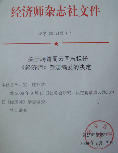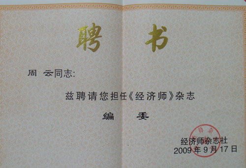 经管学院周云老师被聘为中国《经济师》杂志社编委委员,《经济师》是全国经济类核心期刊,是经济管理学术界很有影响的学术期刊之一。周云老师被聘为编委委员扩大了我院的社会影响力。