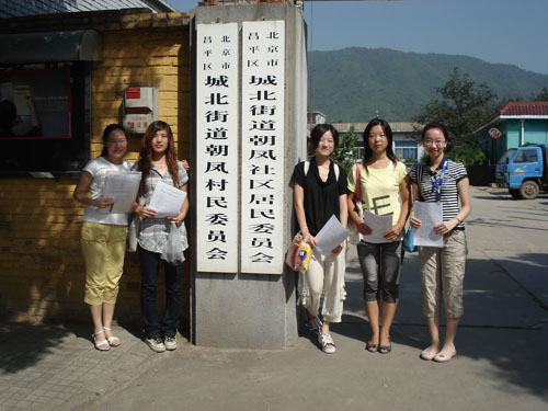 2009年8月23日上午,北京农学院经管学院206413班农经特色小组一行5人来到昌平区朝凤庵村开展了关于农村人口文化程度和就业关系的一系列调查访问活动。烈日炎炎的处暑时节,组员丁吟、红乐、郑岩、苑雪、刘丽丽手拿问卷和自己准备的小礼物,带上热情的微笑走到村民面前。经过一个上午耐心询问,小组共获取数十位男女老少村民的相关真实信息,并通过个别访问,成功获得预期的调查效果,同时还收到了村民们的好评。在调查中,小组来拜访了村大队,同时了解到很多朝凤庵村的信息。朝凤社区位于昌平城区东北侧,十三陵水库路西侧,毗邻著名的十三陵水库风景区。区域面积3.5平方公里,现有耕地216亩,人口1218人,其中男性590人,女性628人。