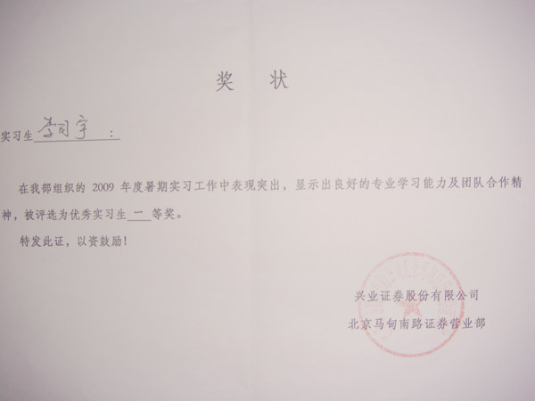 8月28日,兴业证券公司为经管学院第一批实习生颁发了奖状和奖金,还为每位同学写了实习鉴定。兴业证券公司作为经管学院教学实践基地,对实习生严格要求、从严管理。实习生也提前体会到了“上班族”的辛苦。尽管如此,实习生做到了认真负责、吃苦耐劳。谈到这次实习,同学们普遍反映在证券业务实践中,接触了社会、开阔了视野、学到了知识。兴业证券公司也高度评价经管学院的实习同学,特此表彰这批实习生。