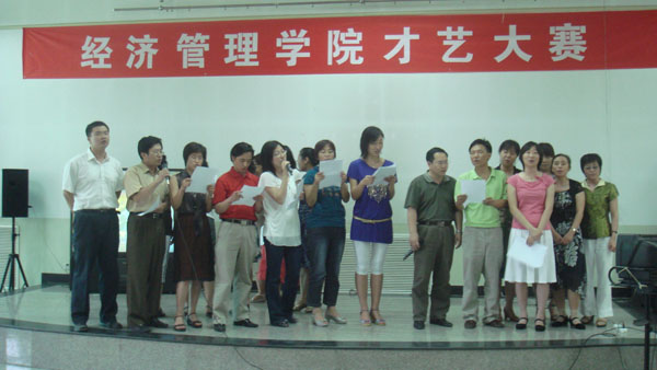 2009年6月3日下午,经管学院分工会经过精心周密的策划和准备,“经管学院才艺大赛”在学校工会如期举行。莅临本次大赛的嘉宾有歌舞协会的孙玲老师、图书馆的高飞老师、科研处的胡宝贵老师等。经管学院的全体教师积极参加此次活动。