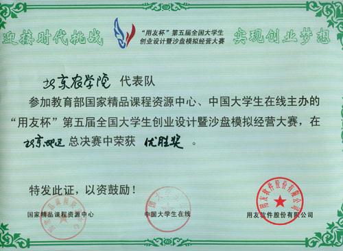 此次大赛由中华人民共和国教育部高等教育司支持、教育部高等学校工商管理类专业教学指导委员会指导、国家精品课程资源中心与中国大学生在线联合主办、用友软件股份有限公司承办。并将大学生创业设计与沙盘模拟有机结合,充分体现了参赛队的全局观念、企业经营的规划、决策能力、团队协作能力和实践能力的实力。经过两天的激烈较量,我校参赛队获得此次比赛的“优胜奖”。