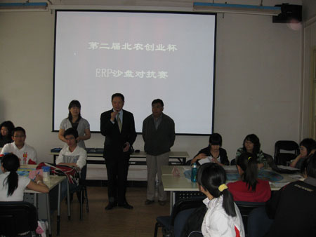 2009年5月16日,第二届北农创业杯ERP沙盘对抗赛落下帷幕。教务处副处长沈文华教授、创业教研室主任李兴稼教授、经管学院刘芳副院长到赛场指导工作并致辞。经管学院赵连静、黄玉梅、刘颖云三位老师组织了比赛的实施。