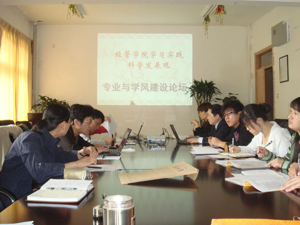 2009年4月17日上午,经管学院召开学习实践科学发展观“专业与学风建设”论坛。会议由经管学院党总支书记李华主持,院长何忠伟、副院长刘芳、刘柳、各教研室主任与各党支部书记、辅导员等参加了此次会议。
