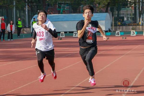 在下午田径场上的男女100米决赛中,看台上的同学阵阵欢呼,打鼓,经管学院女生康子君,王雪萌,男生方绪阳,于志旻在起跑线上做好十足的准备,枪声一响,便全力冲向终点。最终女生康子君,男生方绪阳取得第四名,王雪萌,于志旻取得第六名的成绩。