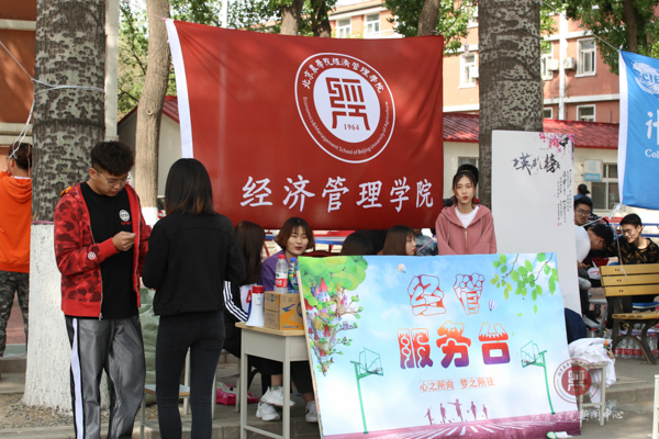 场外经管学院服务台,码着一箱箱的水、摆着各式各样的食物,为运动员们补充水分和能量。同时服务台同学还会及时帮助运动员们解决突发问题,为他们保驾护航,让他们可以全身心地在投入比赛,奋力拼搏。