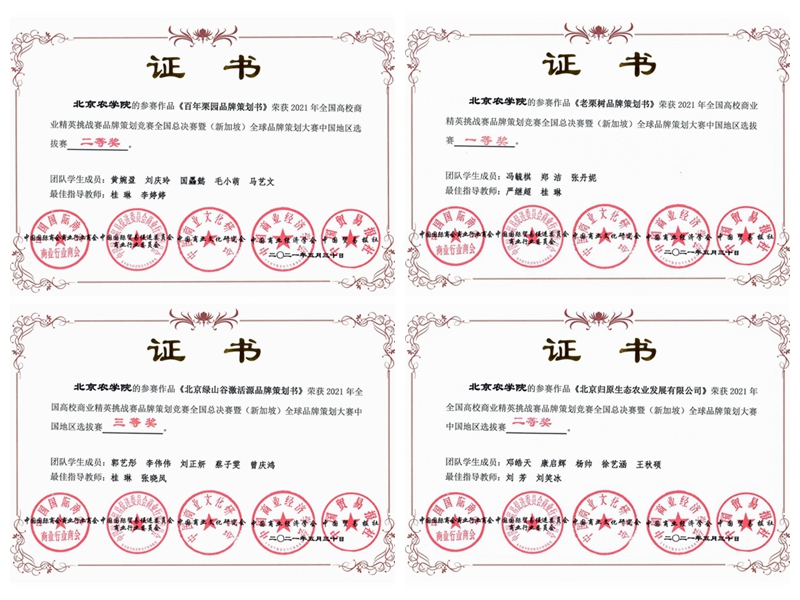 2021年5月29日至2021年5月30日,经管学院组建4个团队参加了“全国高校商业精英挑战赛+品牌策划竞赛全国总决赛暨(新加坡)全球品牌策划大赛中国地区选拔赛”。来自全国110所高校,299个参赛团队参加了激烈角逐,最终经管学院获得一等奖1项,二等奖2项和三等奖1项的佳绩。其中的《老栗树品牌策划书》斩获“2021年全国总决赛一等奖,并入围(新加坡)全球品牌策划大赛”,成为18个参加新加坡全球品牌策划大赛的中国团队之一,也是北京参赛高校唯一一个进入全球赛的团队,并将代表中国赛区参加全球总决赛。
