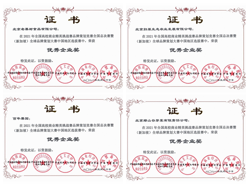 为响应中国贸促会2021年促进中小企业发展工作重点项目——“百所高校服务百家中小企业品牌建设与国际市场开拓专项活动”的相关精神,经管学院积极与老栗树聚源德种植合作社、北京百年栗园生态农业有限公司、归原生态、北京绿山谷芽菜有限责任公司4家涉农企业开展校企合作,组建了由6名指导教师和18名学生参加的4个品牌方案策划团队。