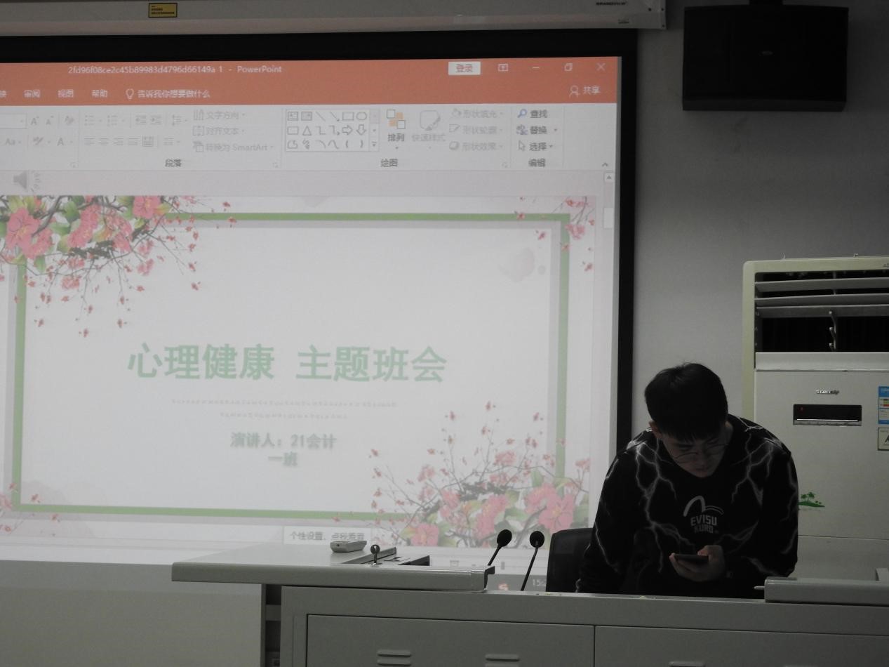 国贸专业的班会设计寓教于乐。制作了“大学生心理健康教育”主题PPT,班委讲解什么是心理健康,如何看待心理问题,如何缓解常见心理问题。将理念植入人心后,班会临时抽取同学做个人心理状态采访,进一步加深印象。最后通过播放大学生心理健康教育的短片,引发同学们的共鸣和思考。