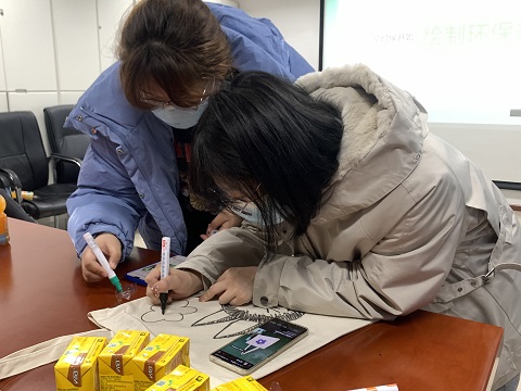 之后是环保袋制作,同学们每三个人为一组,各组分工合作,开展了环保袋制作环节。各位干事奇思妙想,认真创作,有画卡通人物的,有画植物的各式各样,各有特色。