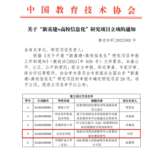 根据中国教育技术协会《关于“新基建+高校信息化”研究项目立项的通知》(教技协研[2022]002号),威廉希尔中文刘芳教授的项目“高校文科类实验教学中心智慧实验室建设研究”获“新基建+高校信息化”重大项目立项。