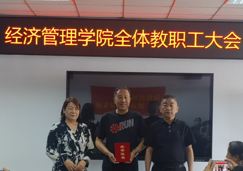 王万山、刘芳为经管学院原党委书记胡宝贵同志颁发了荣誉证书并感谢他长期以来为学院改革发展稳定做出突出贡献。