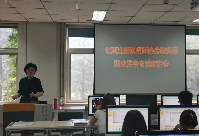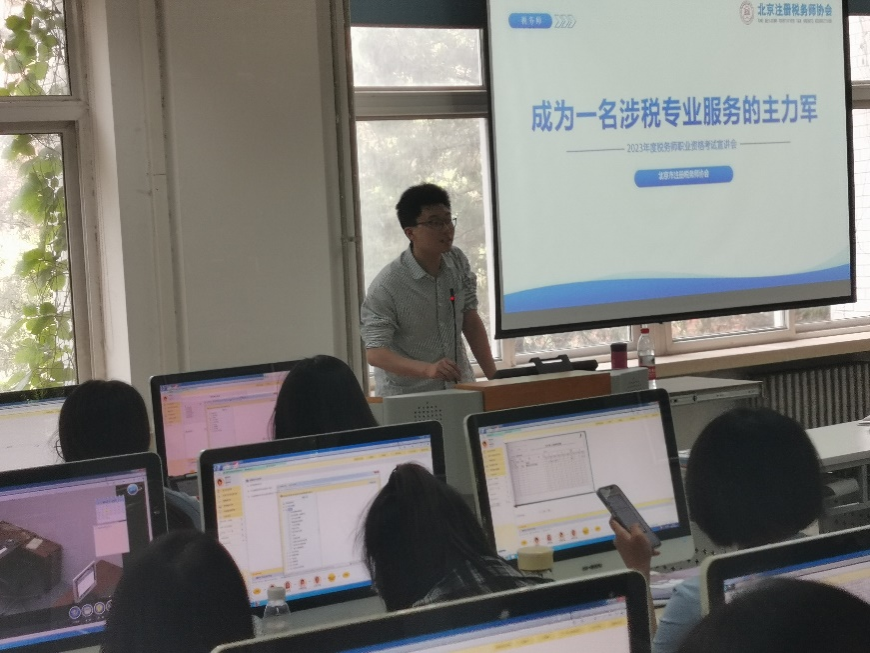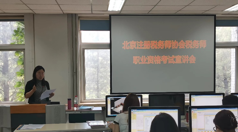 首先,学院副院长刘笑冰介绍与会嘉宾和此次宣讲会的重要意义并致欢迎词。其后,郑东霞秘书长介绍了北京注册税务师协会是当前涉税专业服务的主力军,共有600余所税务所和5300余名从业税务师。她指出,会计学大三学生具有备考税务师得天独厚的优势,也是最佳的学习时机,并鼓励在场学生在毕业前多考证书,助力未来就业。接下来,会计系主任张宁老师对长期合作的校级人才培养基地北京鑫税广通税务师事务所进行了介绍。王进董事长为在场会计专业学生注册税务师行业的历史起源和发展脉络,讲解了税务会计师的从业范畴和就业方向,极大地激发了同学们对税务师职业的从业热情。最后,业务培训部邢帮杰主任介绍了税务师职业资格考试相关事项,对报名时间、程序、费用和方法等进行了详细的介绍和悉心的指导。在场同学纷纷记录学习,表现出了浓厚的兴趣。